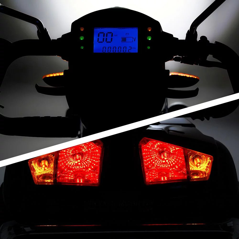 Luminous front headlights light the way ahead, while vibrant taillights illuminate the path behind you.