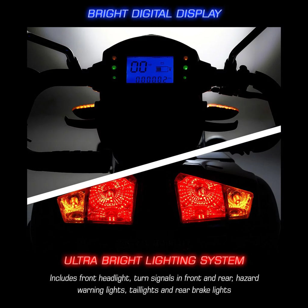 - Ultra bright lighting system includes front headlight, turn signals in front and rear, hazard warning lights, taillights and rear brake lights